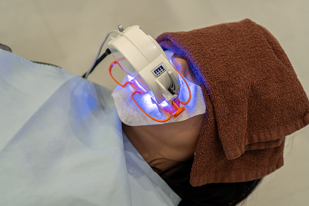 その後、ホワイトニング剤を歯の表面に塗布し、漂白効果を高めるために光を6〜12分当てます。(知覚過敏の強い方は時間を短くしたりします。)
